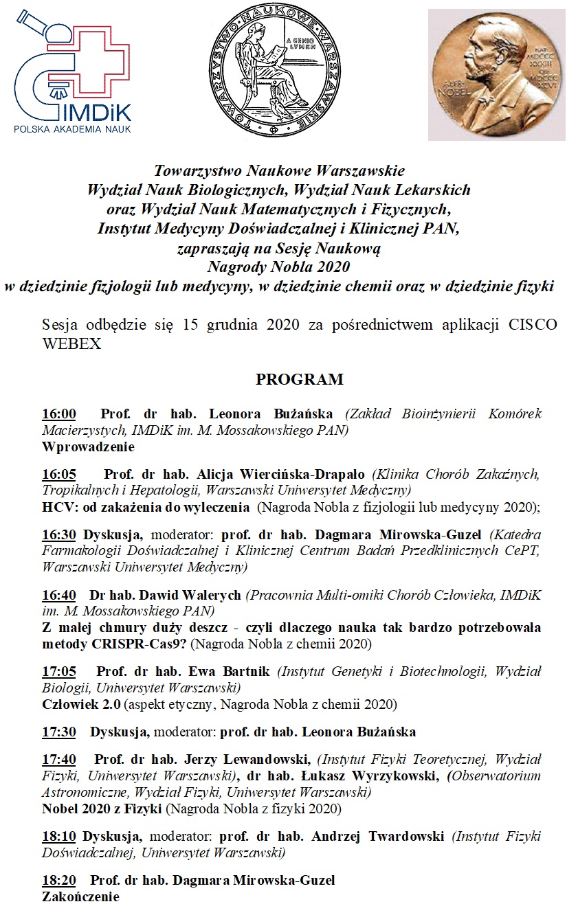 Towarzystwo Naukowe Warszawskie, Wydział Nauk Biologicznych, Wydział Nauk Lekarskich oraz Wydział Nauk Matematycznych i Fizycznych, Instytut Medycyny Doświadczalnej i Klinicznej PAN, zapraszają na Sesję Naukową: Nagrody Nobla 2020 w dziedzinie fizjologii lub medycyny, w dziedzinie chemii oraz w dziedzinie fizyki.